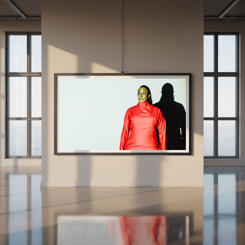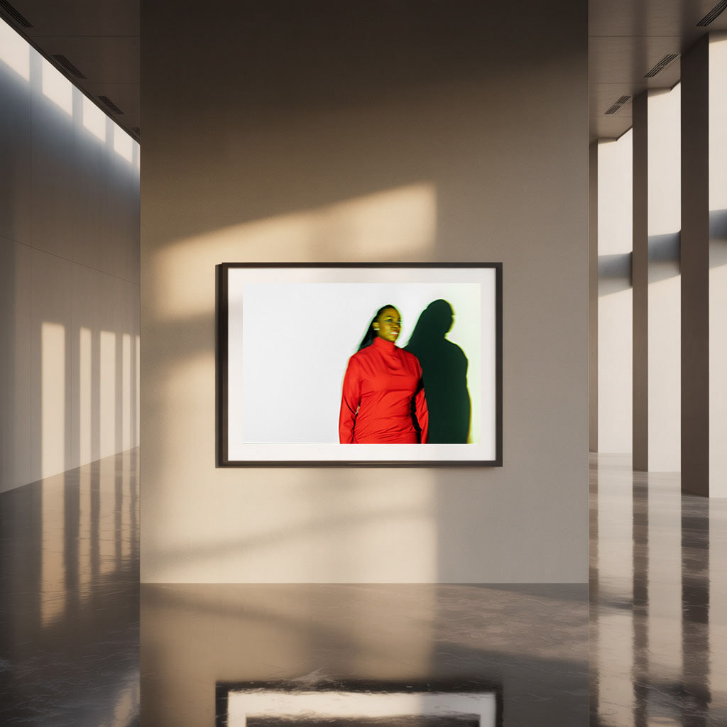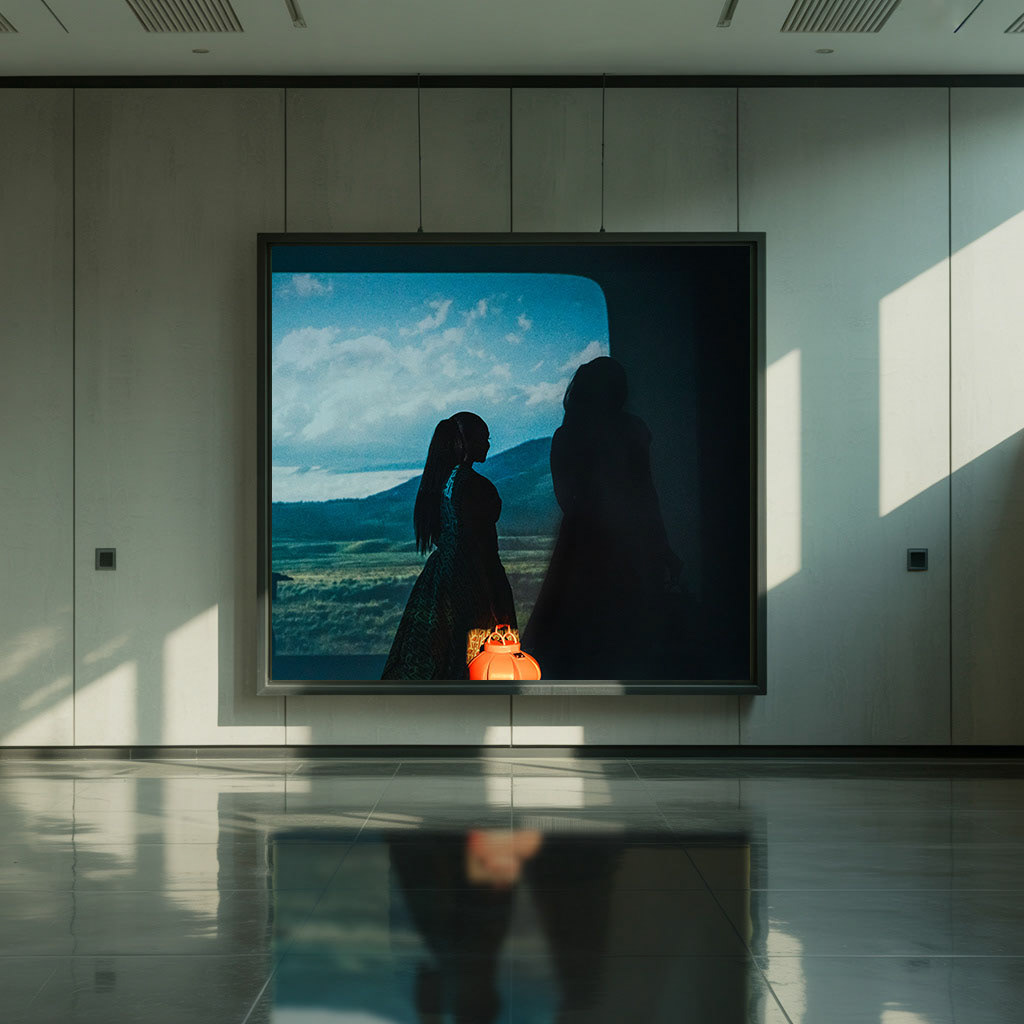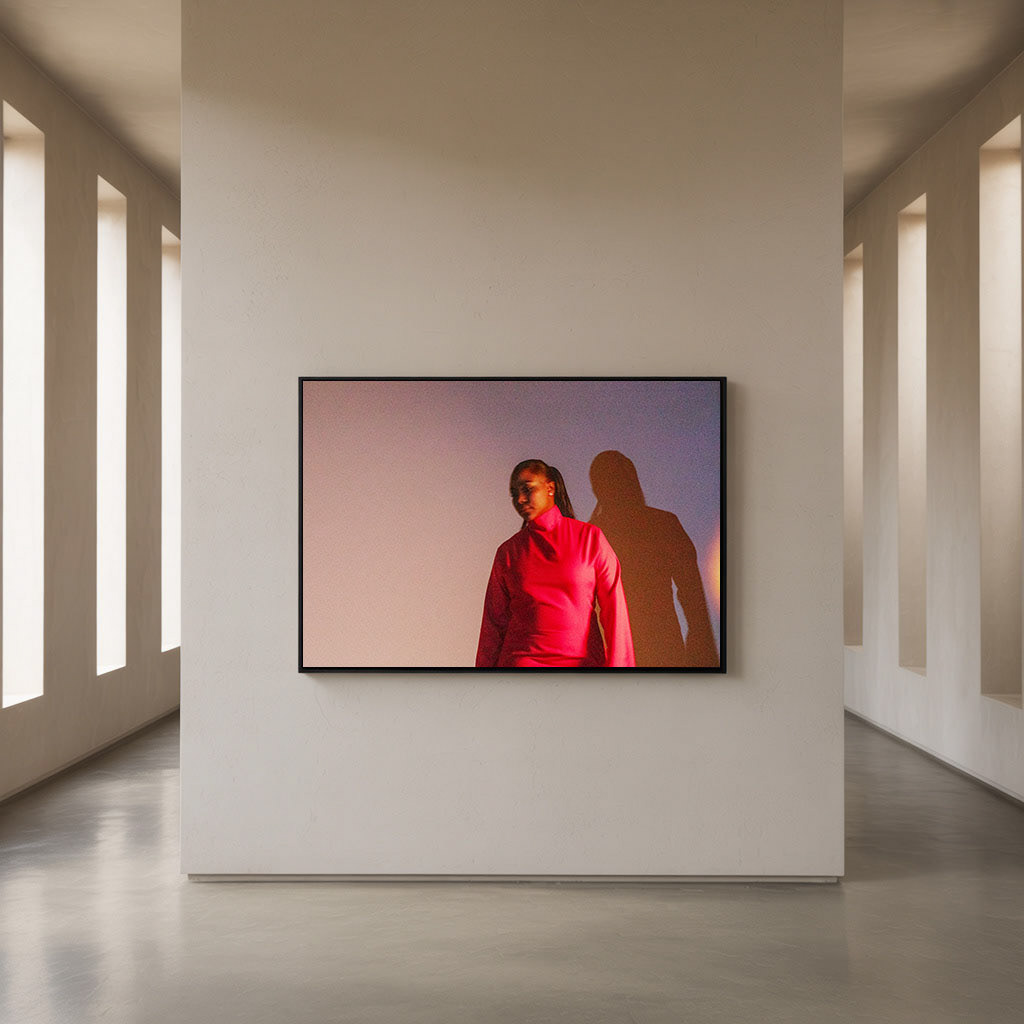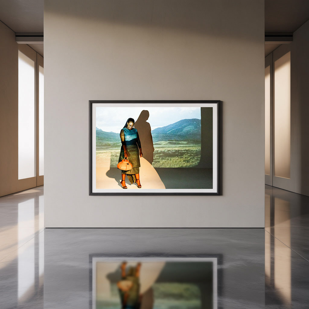 She stands where memory and presence meet — half in light, half in trace. The projection behind her recalls a landscape longed for or left, while her shadow stays rooted in now. A portrait of grace between what was and what remains.