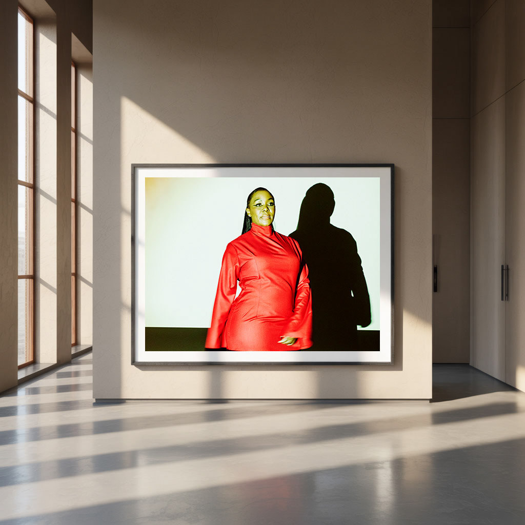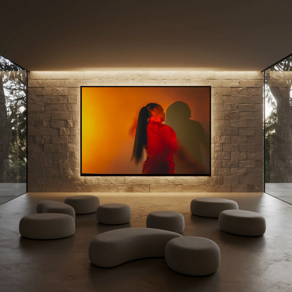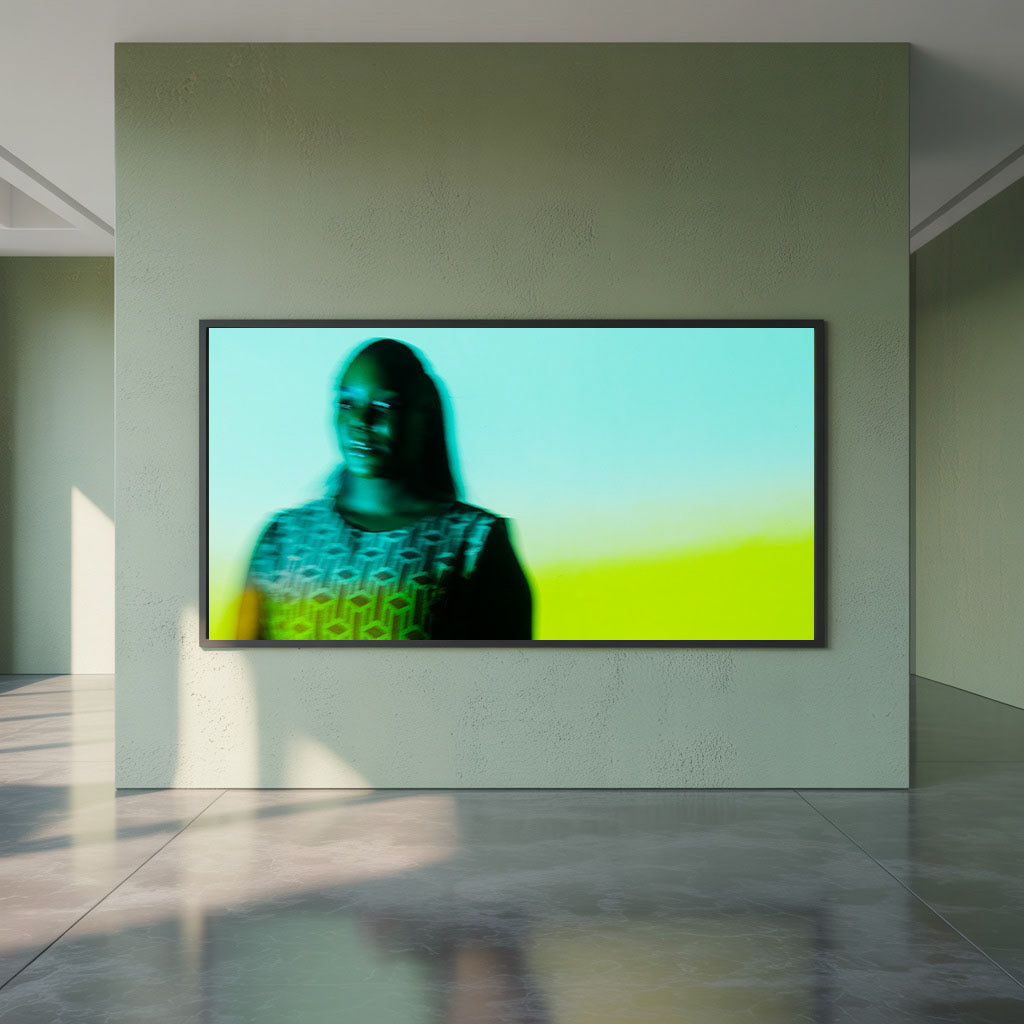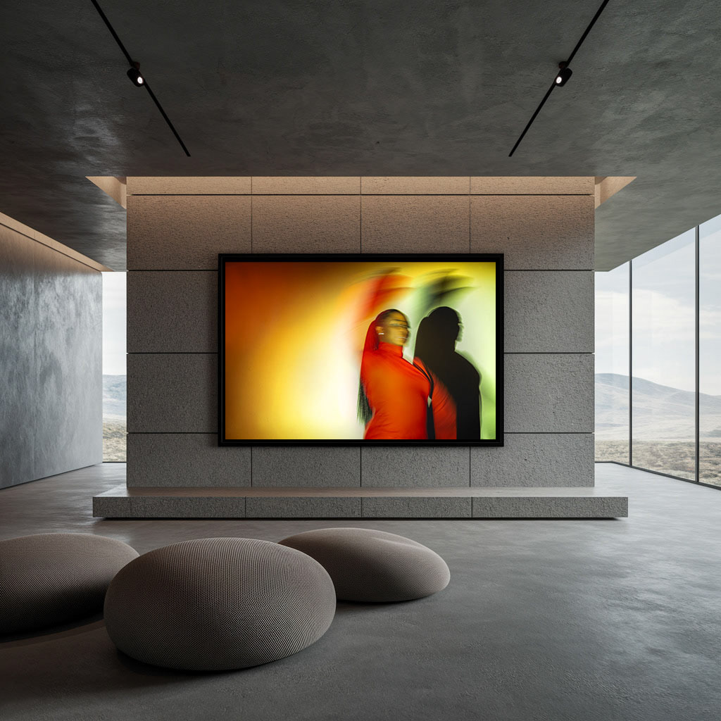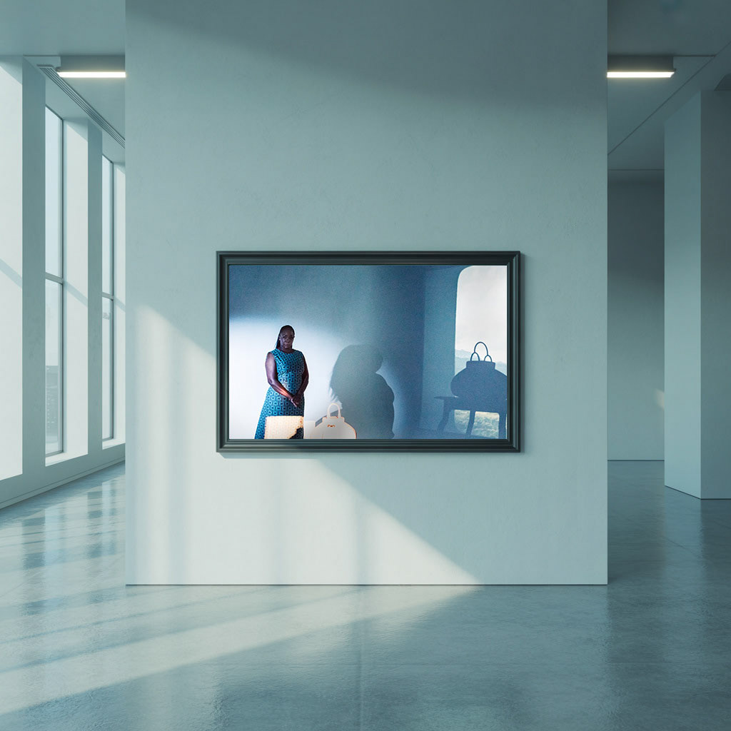 She stands where memory and presence meet — half in light, half in trace. The projection behind her recalls a landscape longed for or left, while her shadow stays rooted in now. A portrait of grace between what was and what remains.