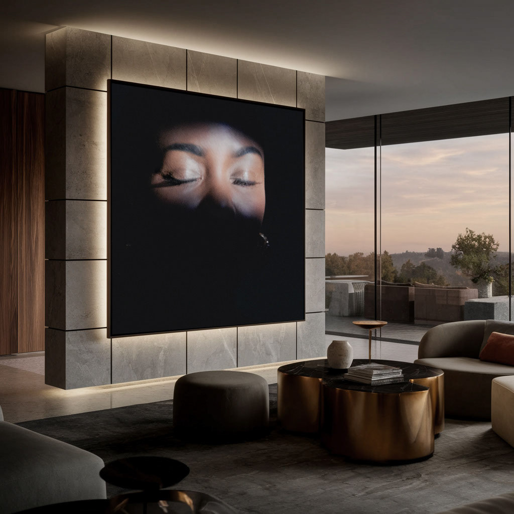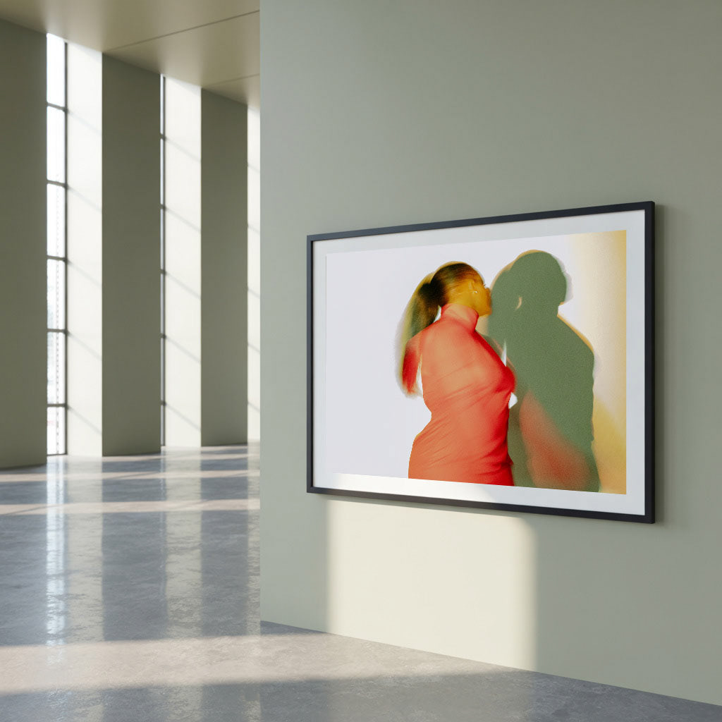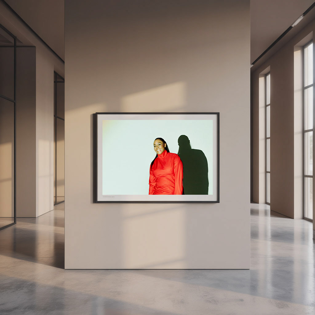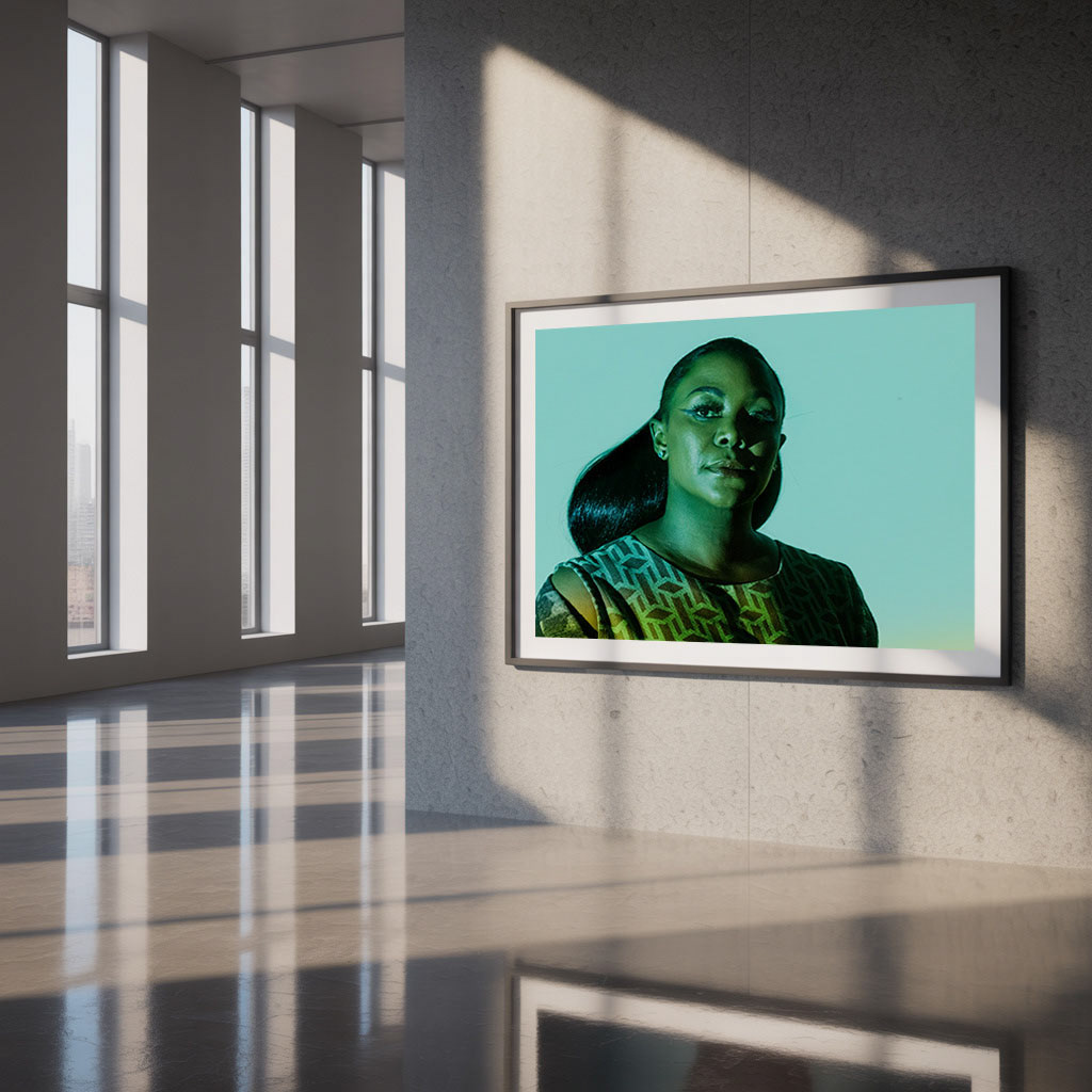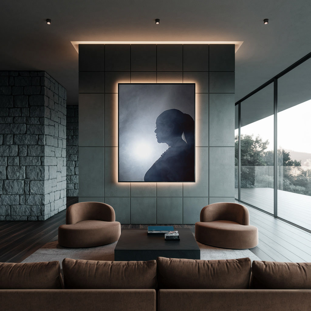 She stands where memory and presence meet — half in light, half in trace. The projection behind her recalls a landscape longed for or left, while her shadow stays rooted in now. A portrait of grace between what was and what remains.