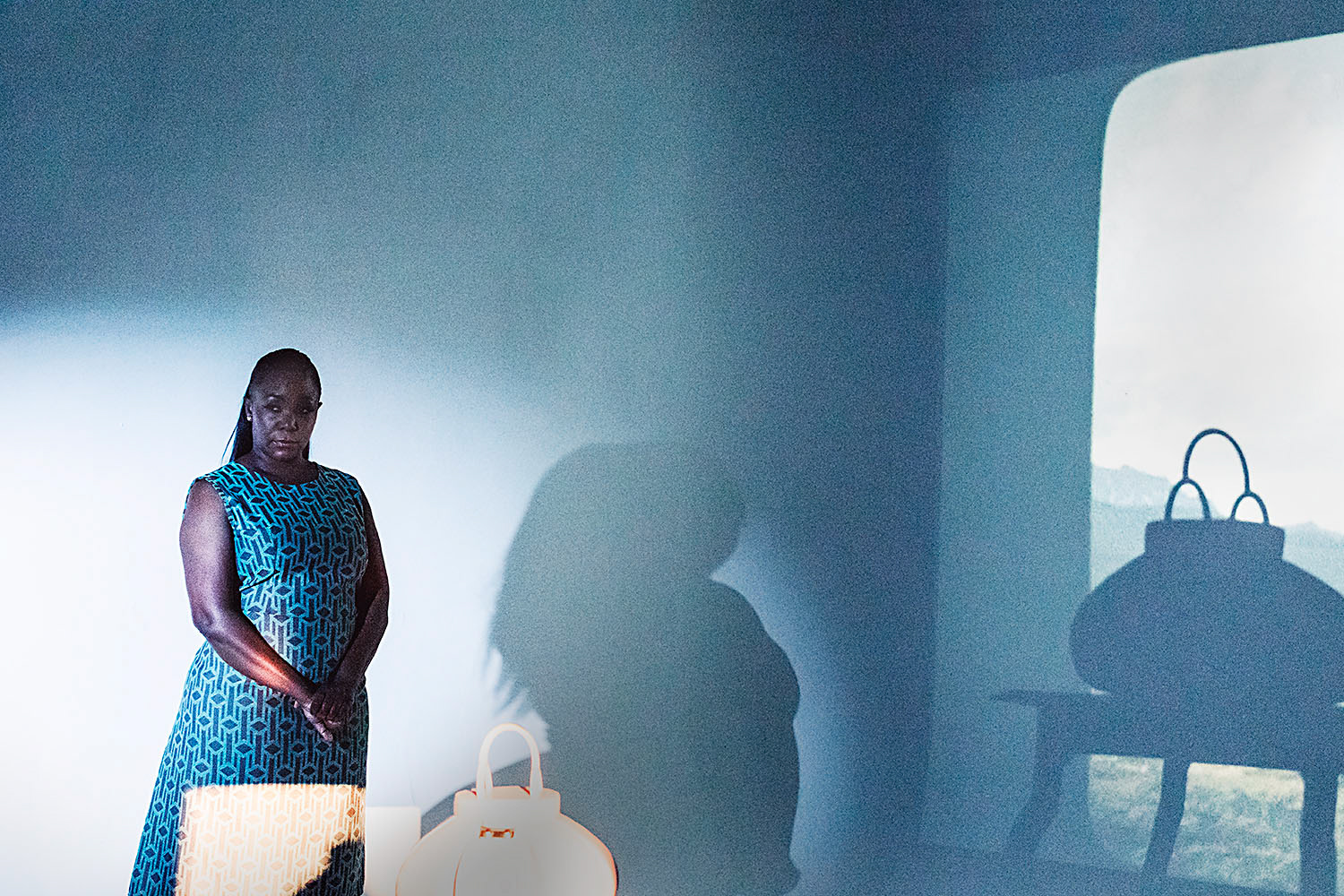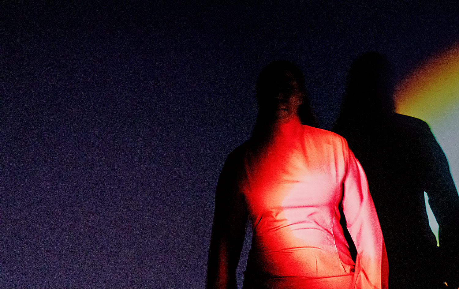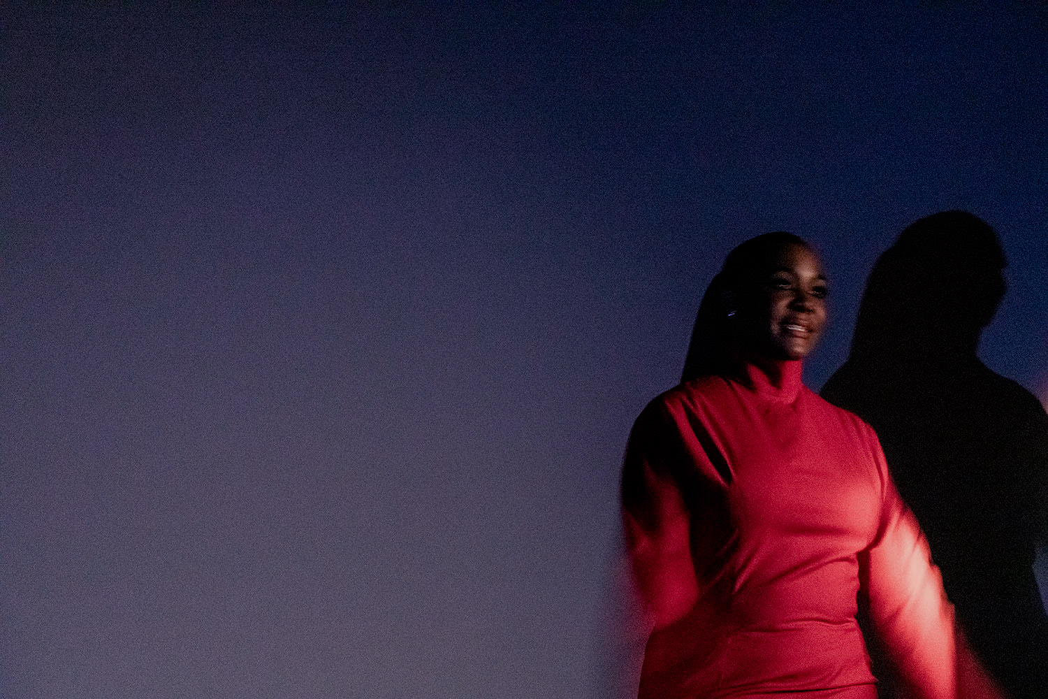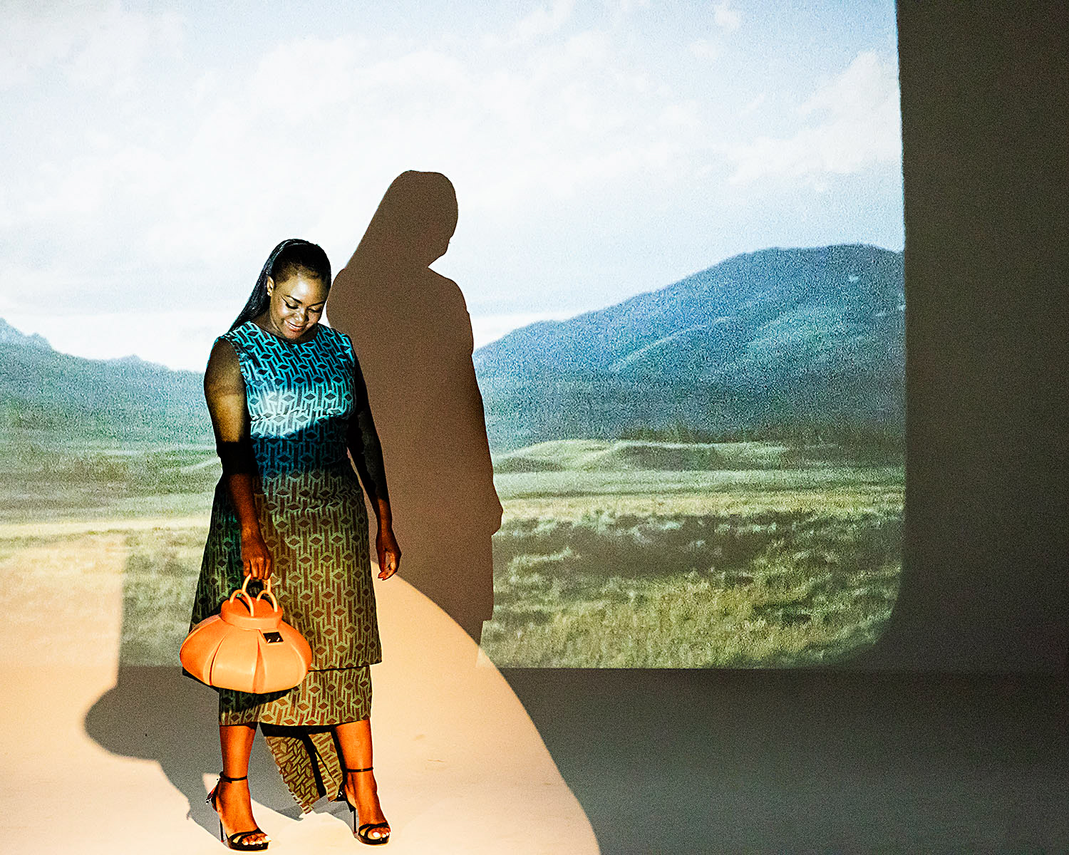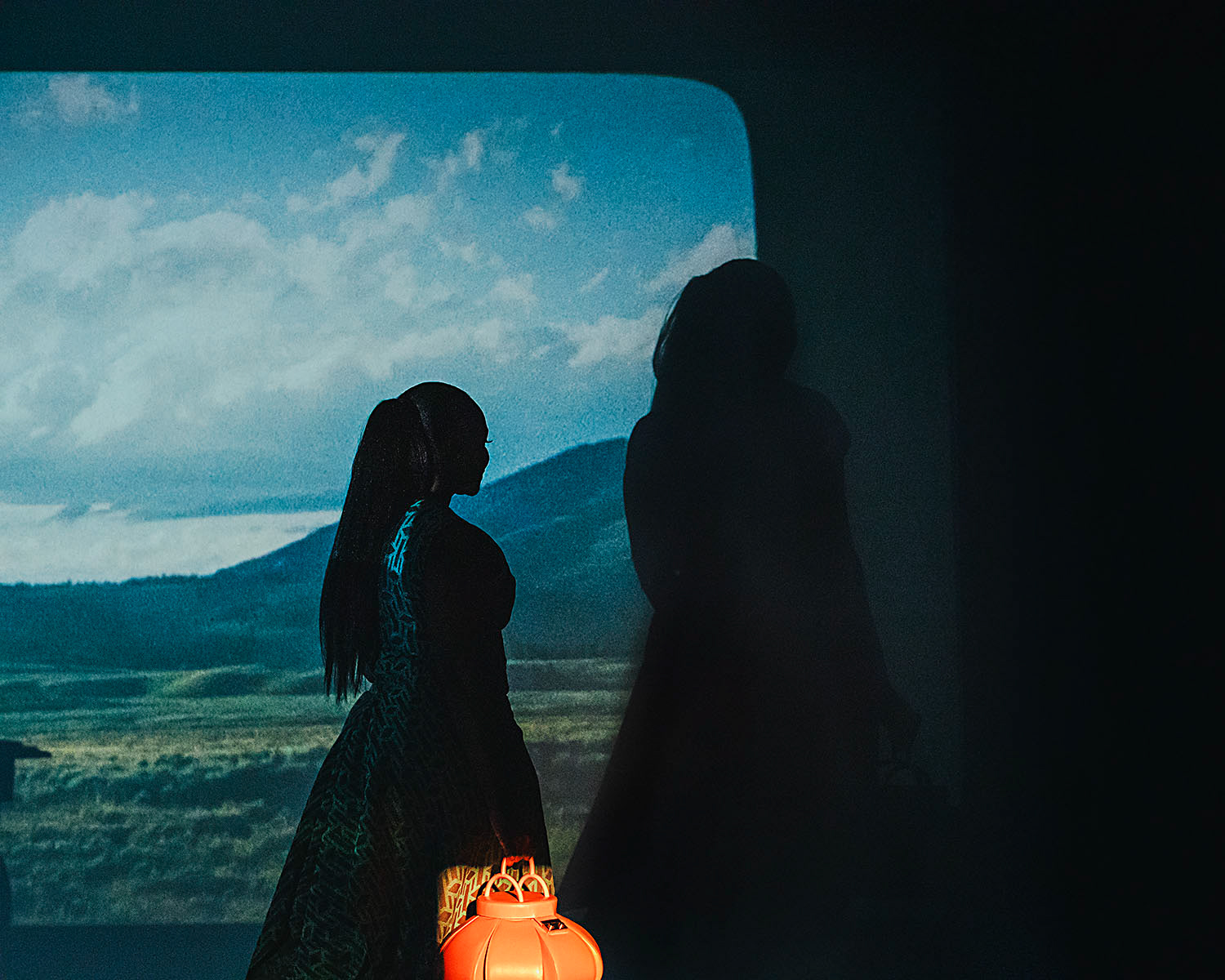 She stands where memory and presence meet — half in light, half in trace. The projection behind her recalls a landscape longed for or left, while her shadow stays rooted in now. A portrait of grace between what was and what remains.