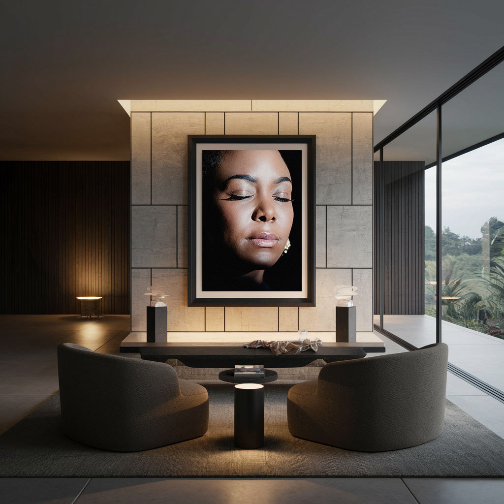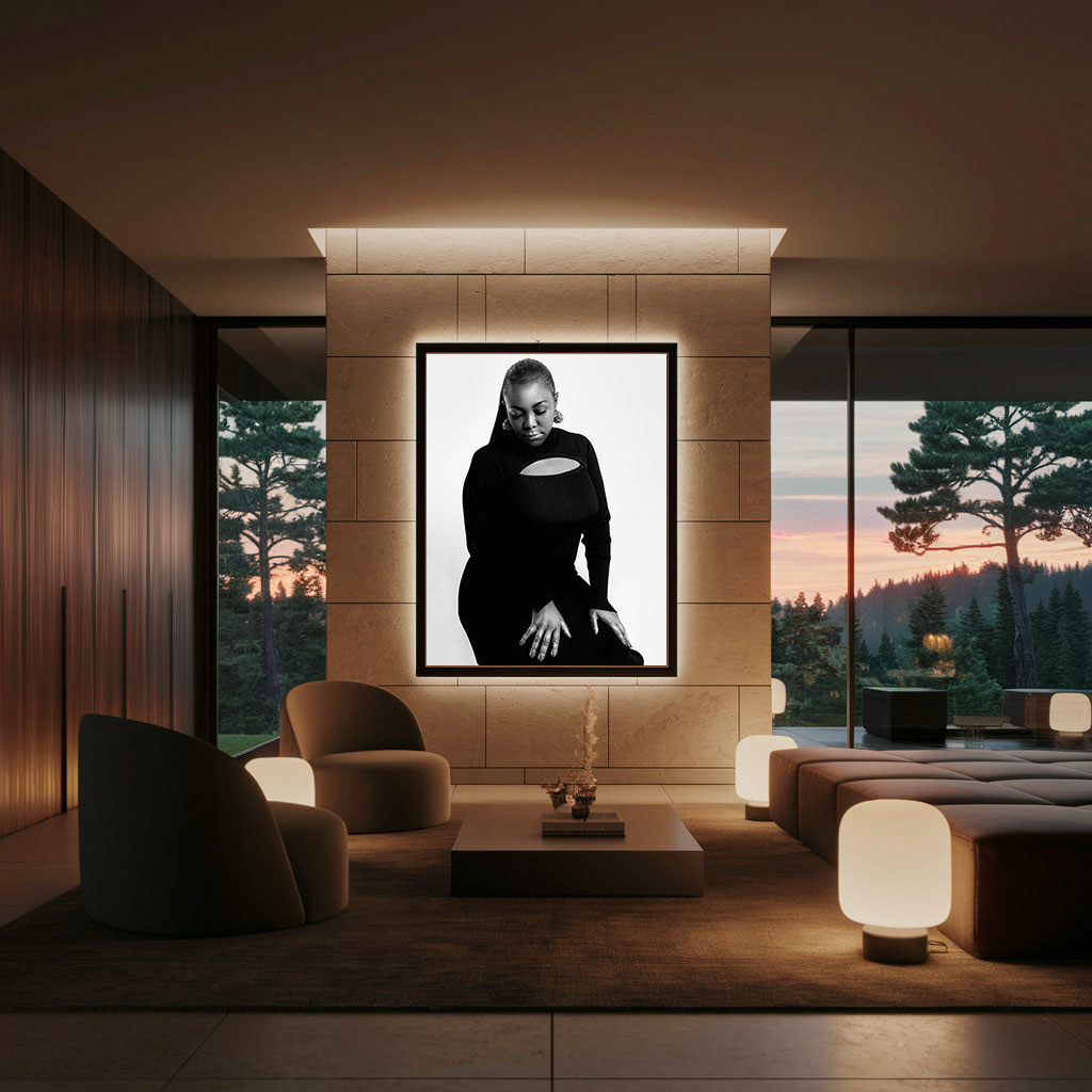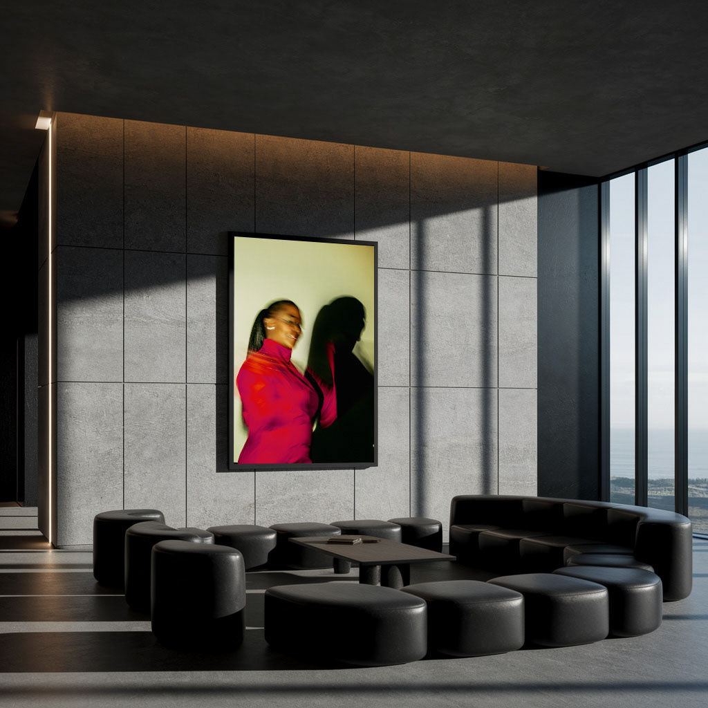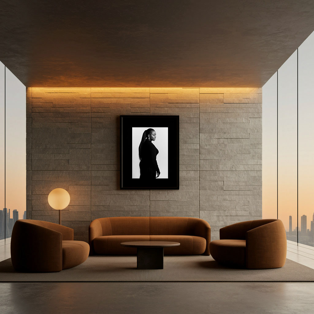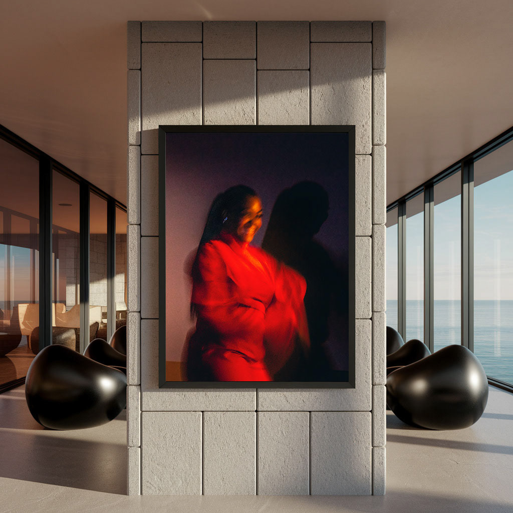 A quiet strength. Framed in her own light, she doesn’t chase the room — she steadies it. Presence, composure, and the silhouette that walks with her.
